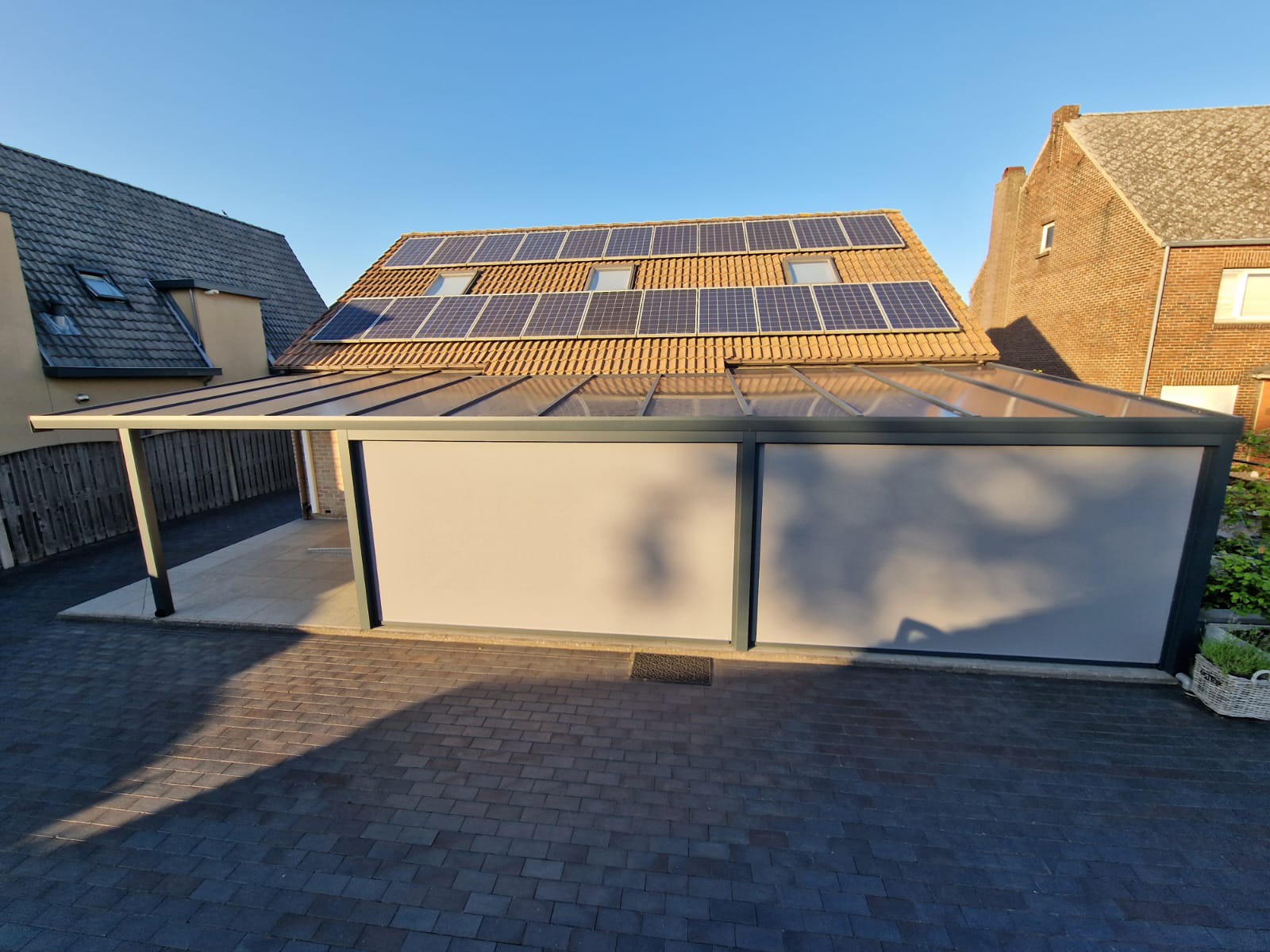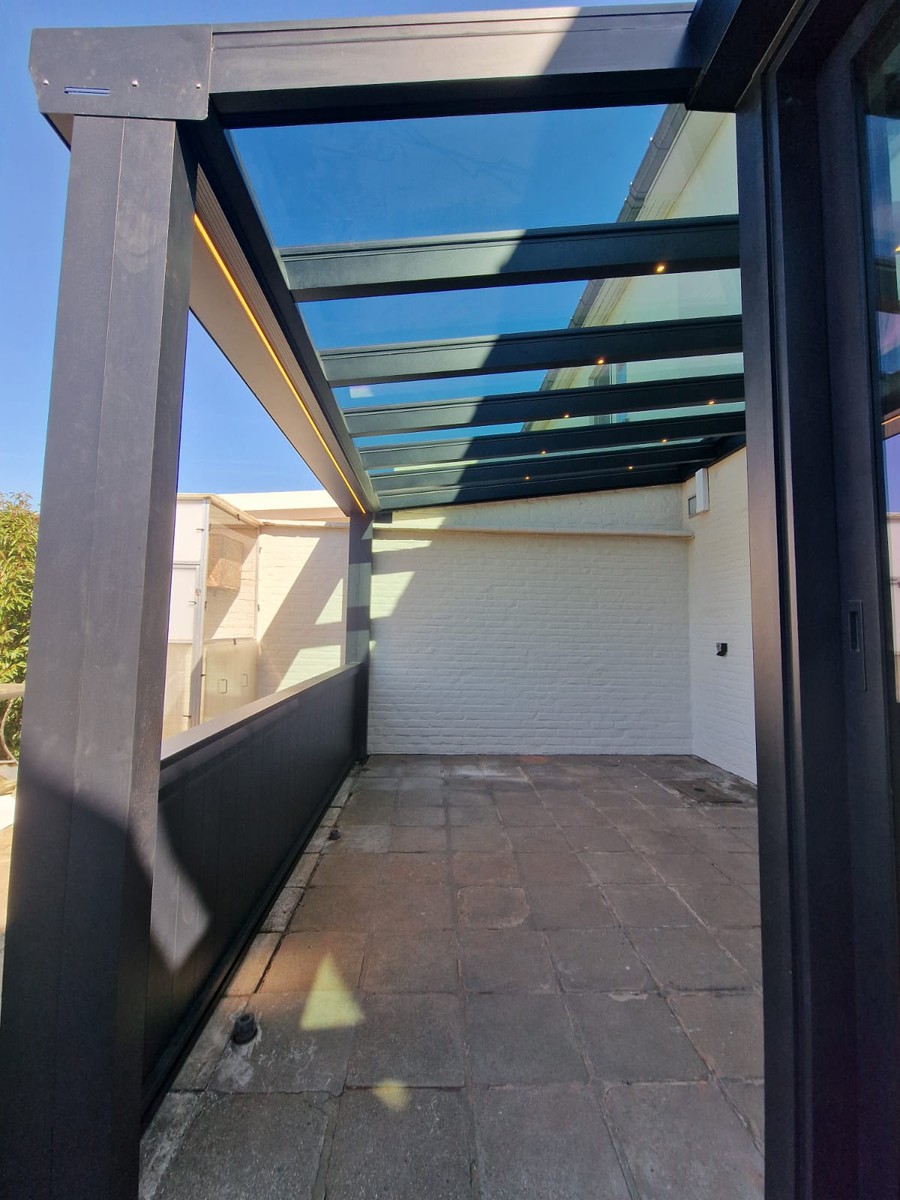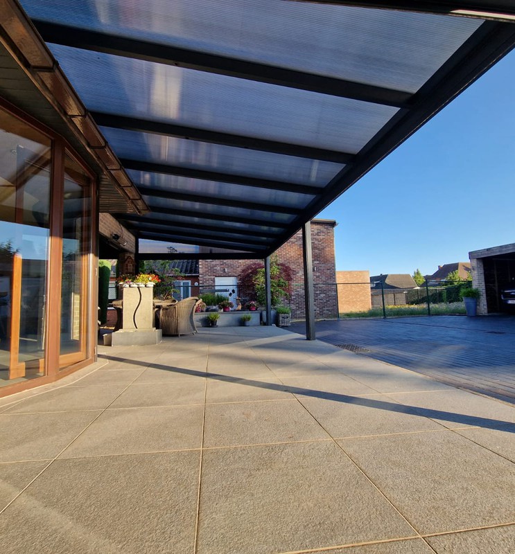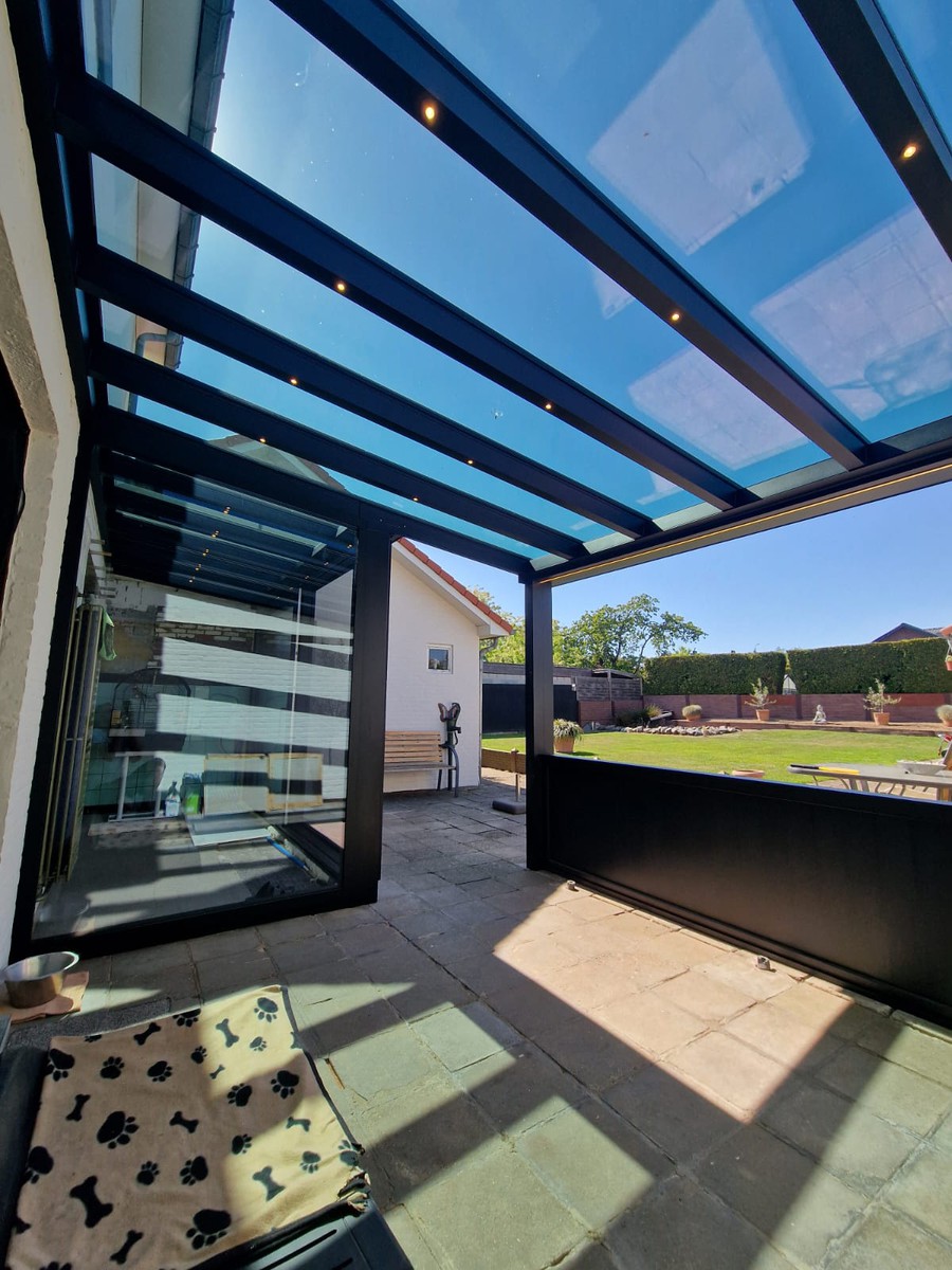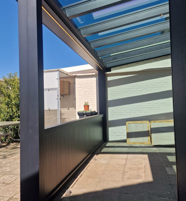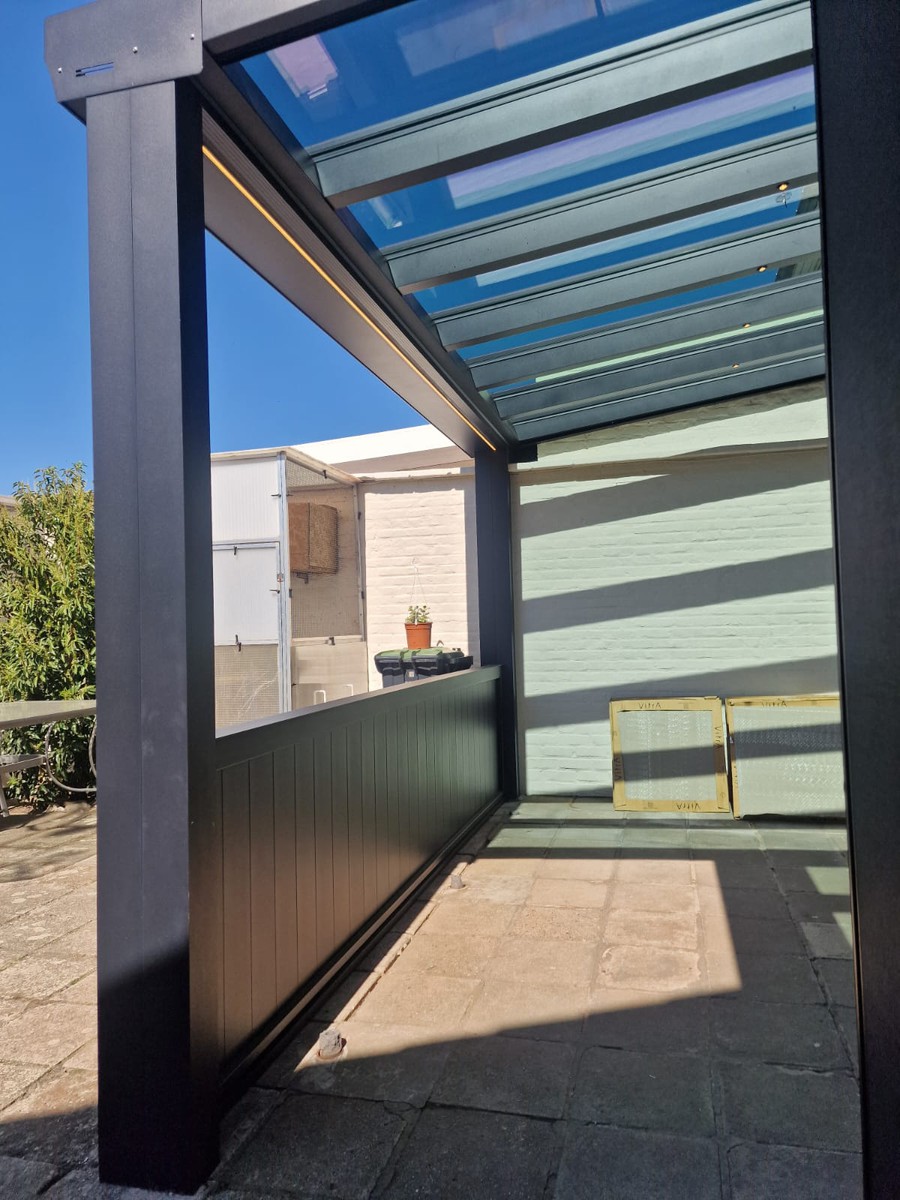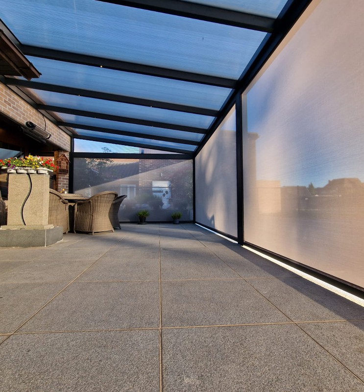 De screen zorgt niet alleen voor extra privacy, maar houdt ook het zonlicht tegen en sluit perfect aan bij de structuur van de overkapping. Van binnenuit blijft het zicht behouden, terwijl inkijk van buitenaf beperkt wordt.