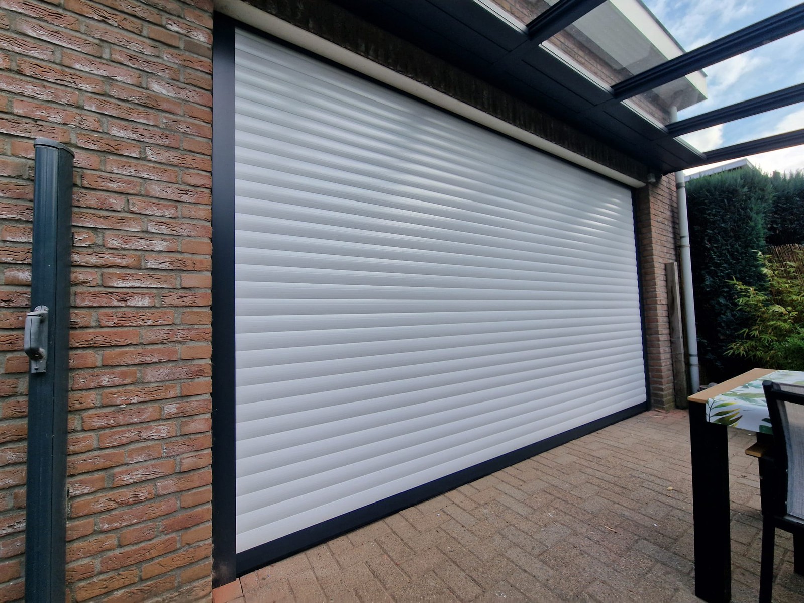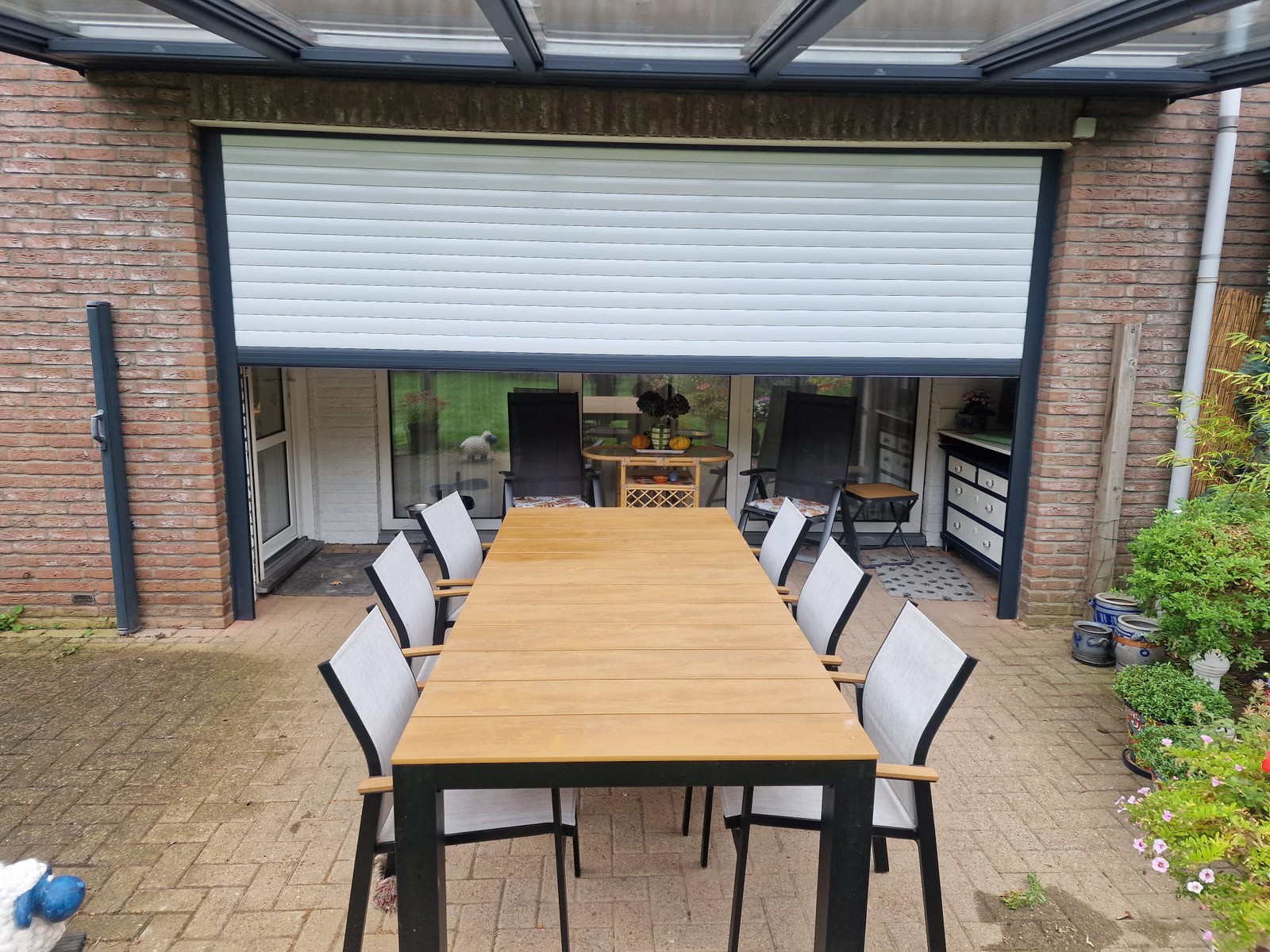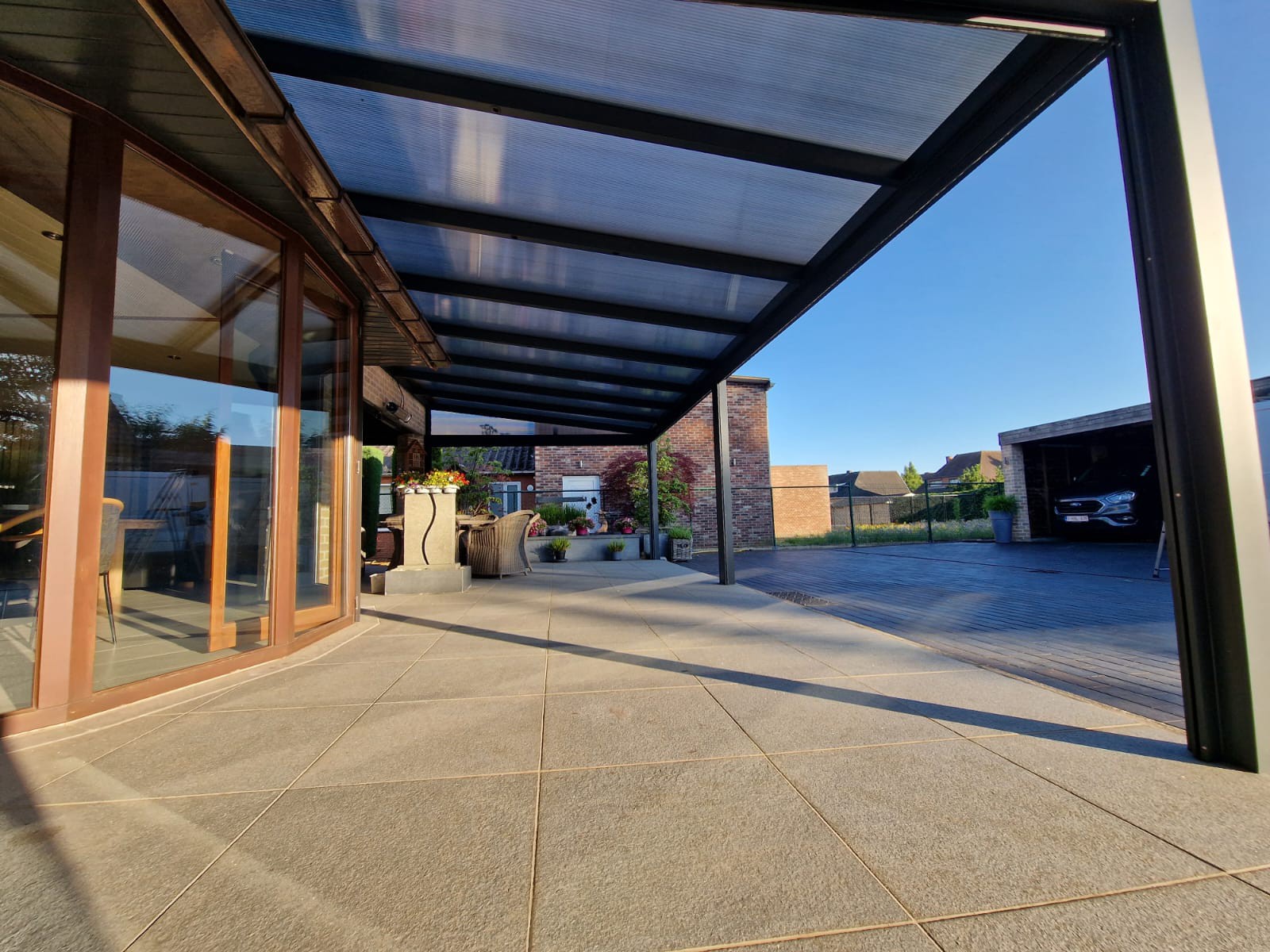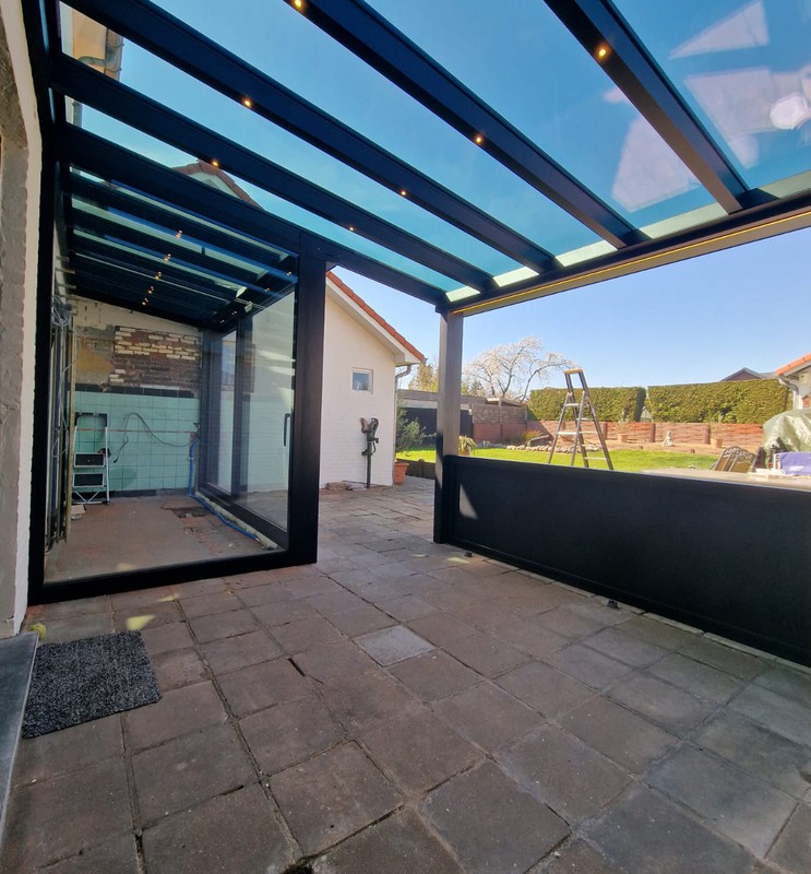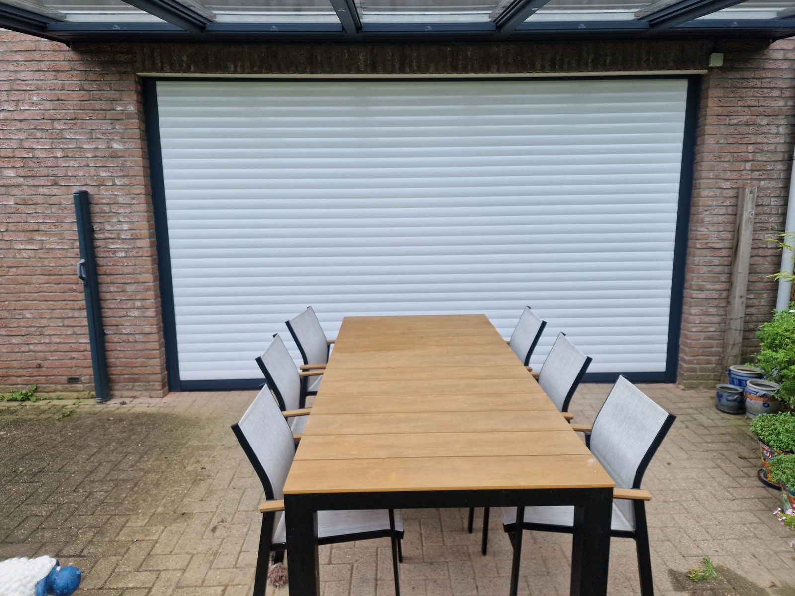 De screen zorgt niet alleen voor extra privacy, maar houdt ook het zonlicht tegen en sluit perfect aan bij de structuur van de overkapping. Van binnenuit blijft het zicht behouden, terwijl inkijk van buitenaf beperkt wordt.