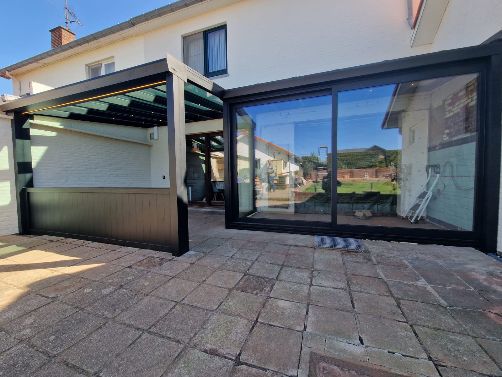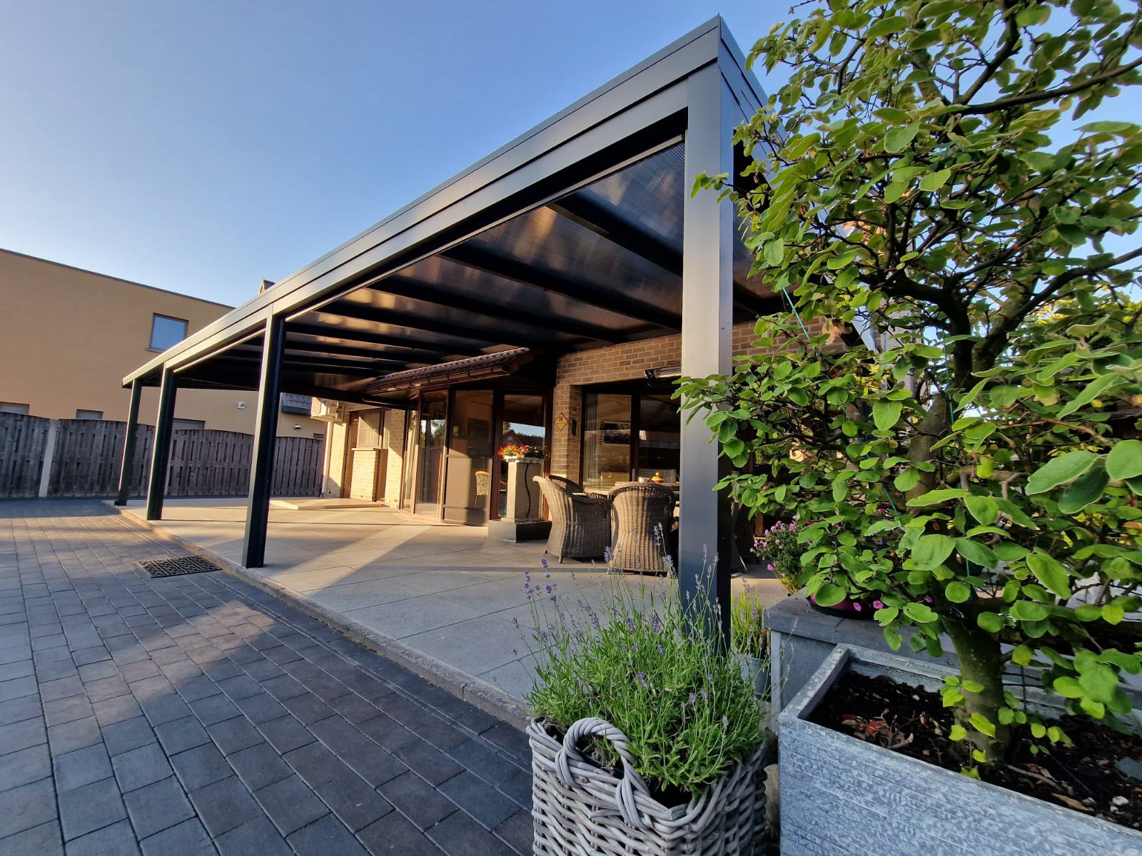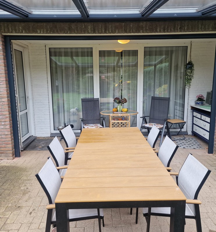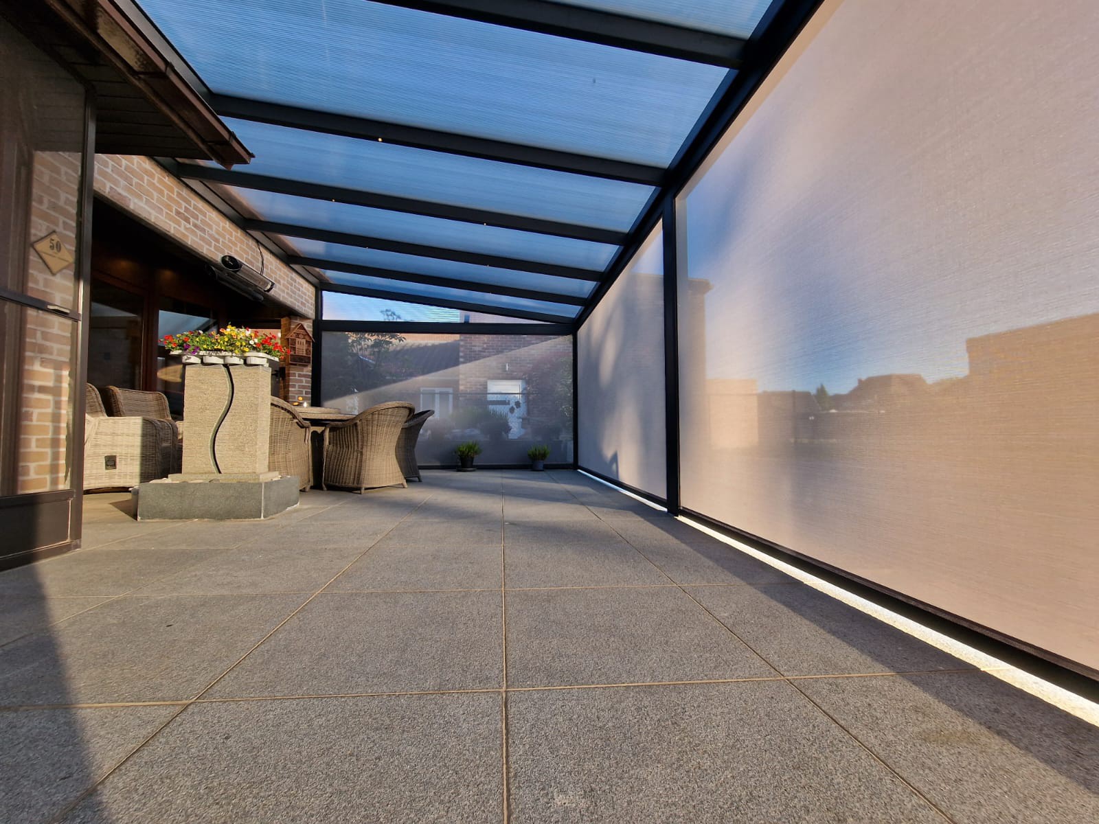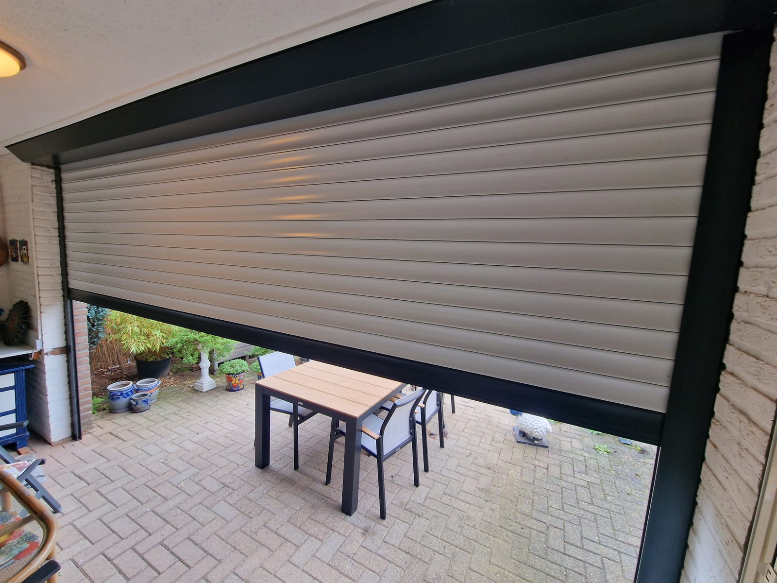 De screen zorgt niet alleen voor extra privacy, maar houdt ook het zonlicht tegen en sluit perfect aan bij de structuur van de overkapping. Van binnenuit blijft het zicht behouden, terwijl inkijk van buitenaf beperkt wordt.