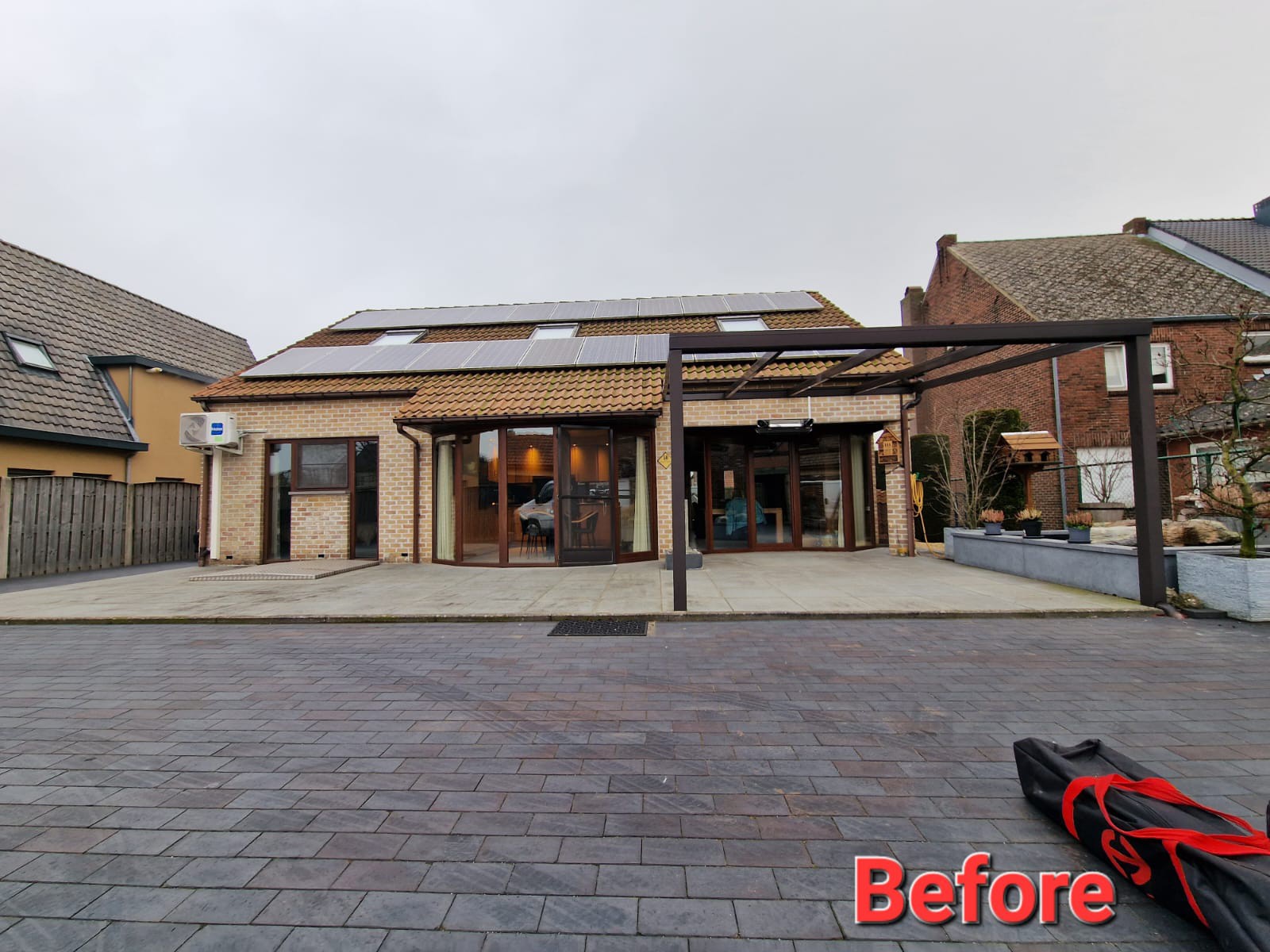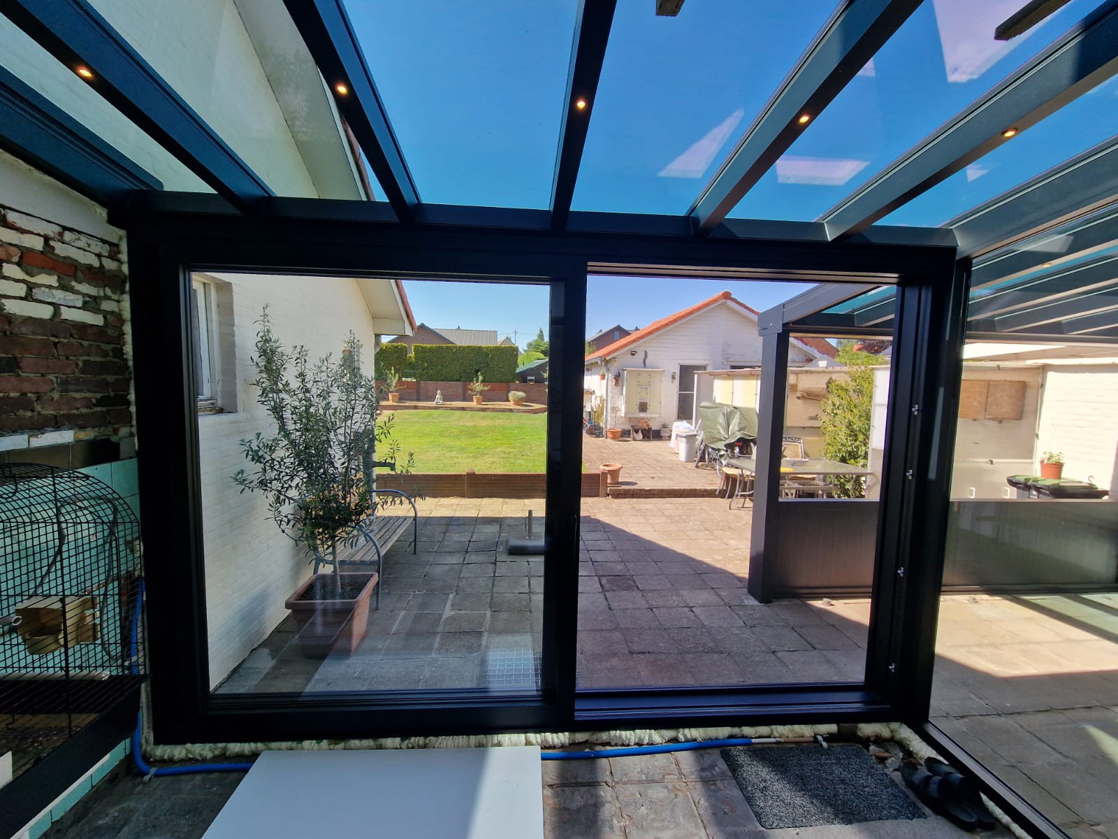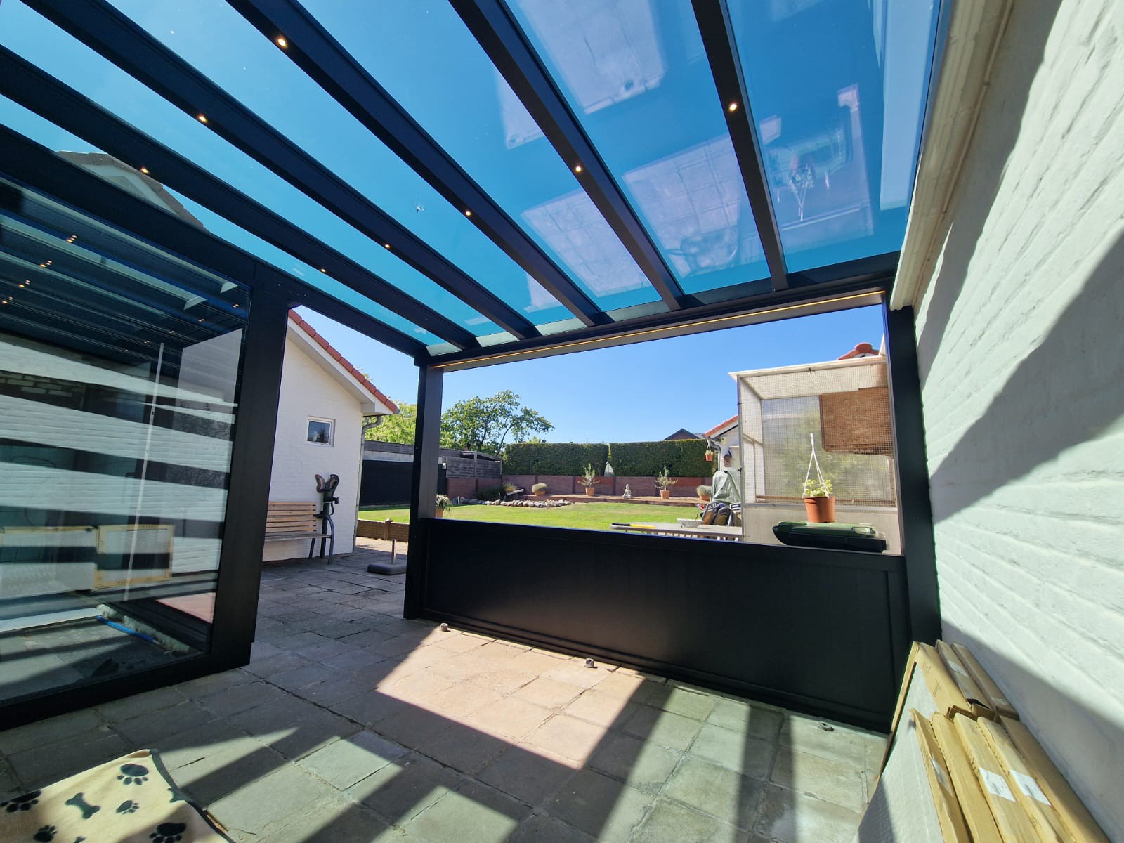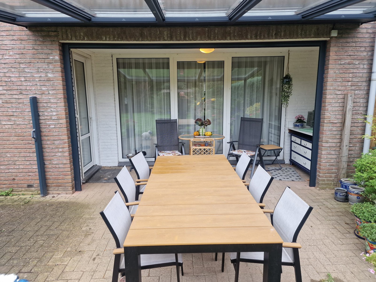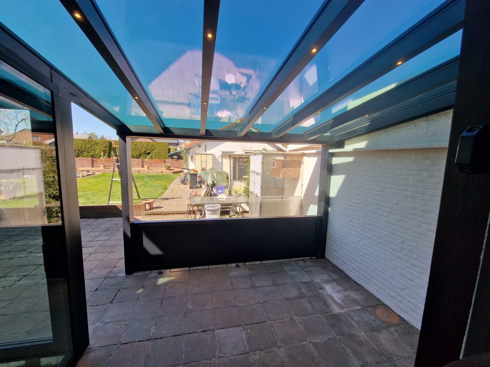 De screen zorgt niet alleen voor extra privacy, maar houdt ook het zonlicht tegen en sluit perfect aan bij de structuur van de overkapping. Van binnenuit blijft het zicht behouden, terwijl inkijk van buitenaf beperkt wordt.