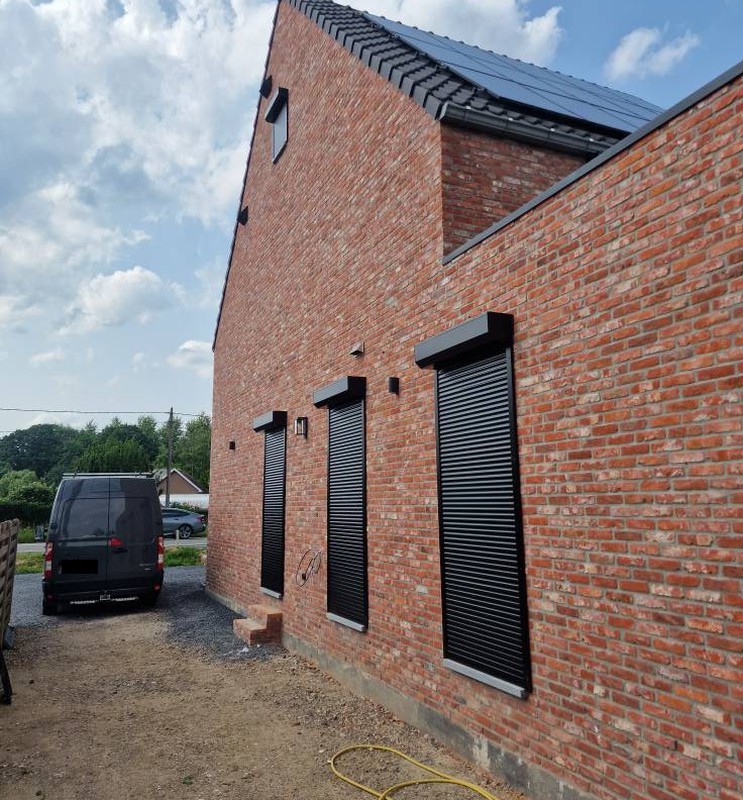 Bij dit project plaatsten we voorzetrolluiken met automatische bediening, afgestemd op de stijl van de woning. De combinatie van een zwarte rolluikkast, zilverkleurige lamellen en zwarte geleiders zorgt voor een strak en modern resultaat.