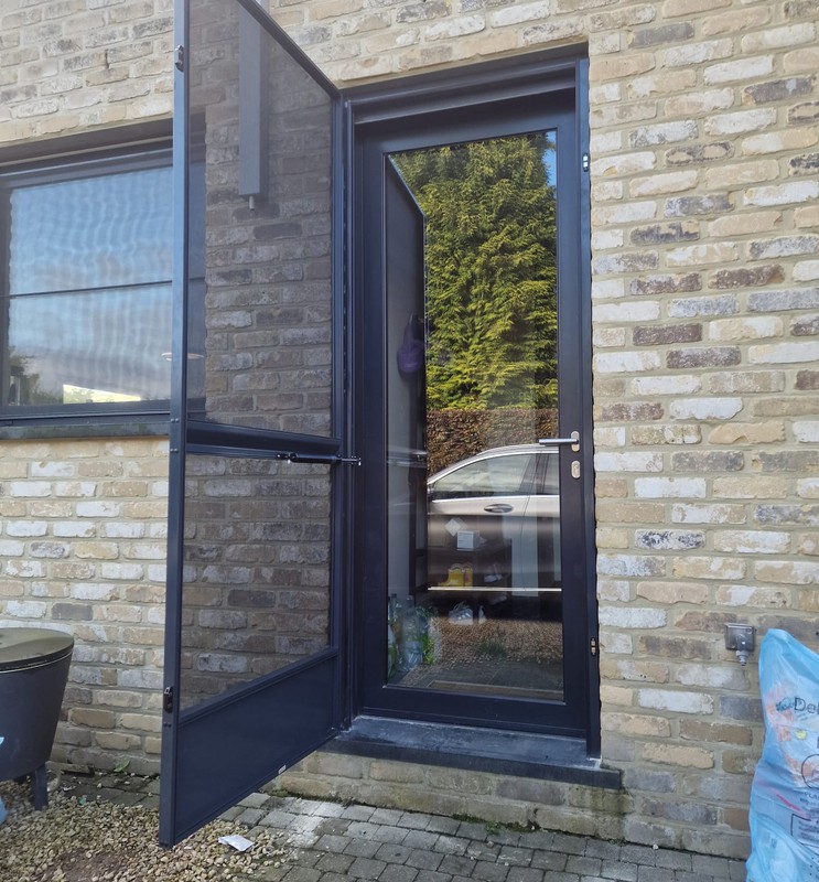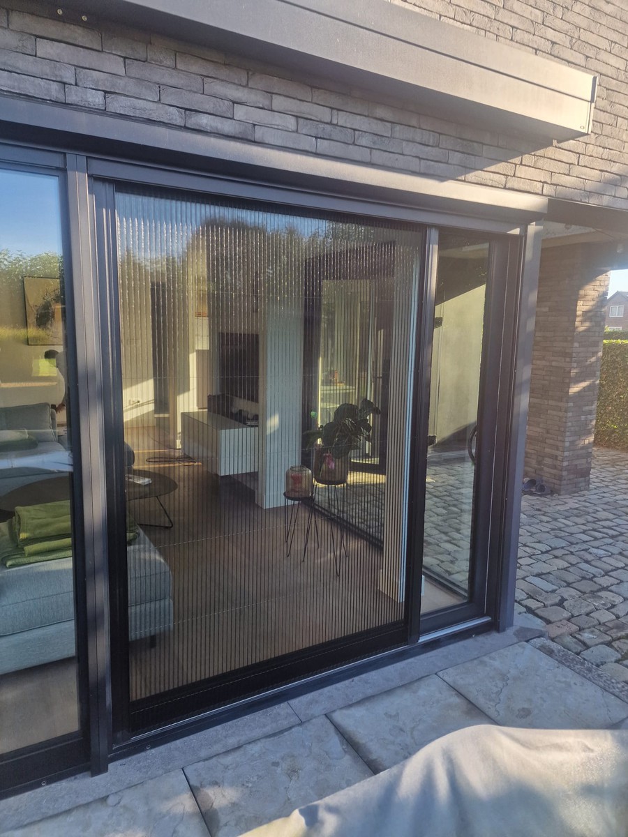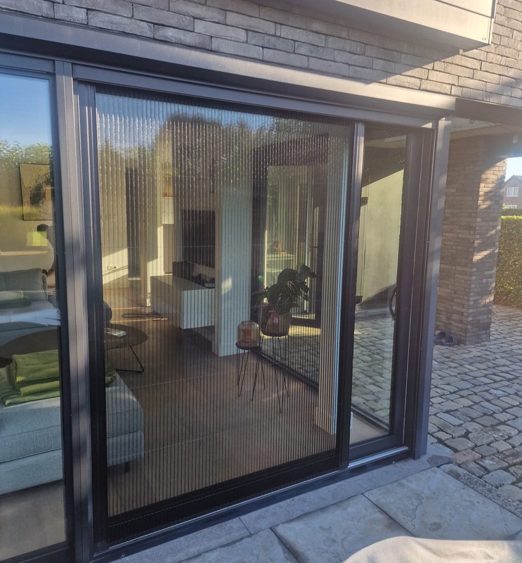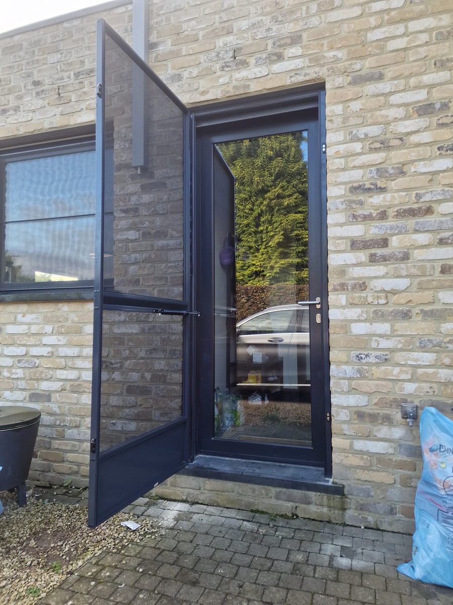 Fijne profielen en zwart of grijs gaas maken het vliegenraam visueel subtiel, zonder in te boeten op werking.