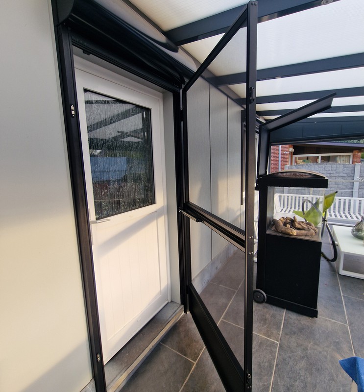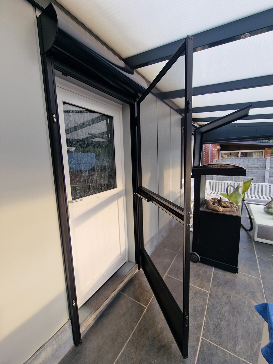 Ook grote schuiframen kunnen voorzien worden van een stijlvolle en stevige vliegendeur – zonder middenprofiel.